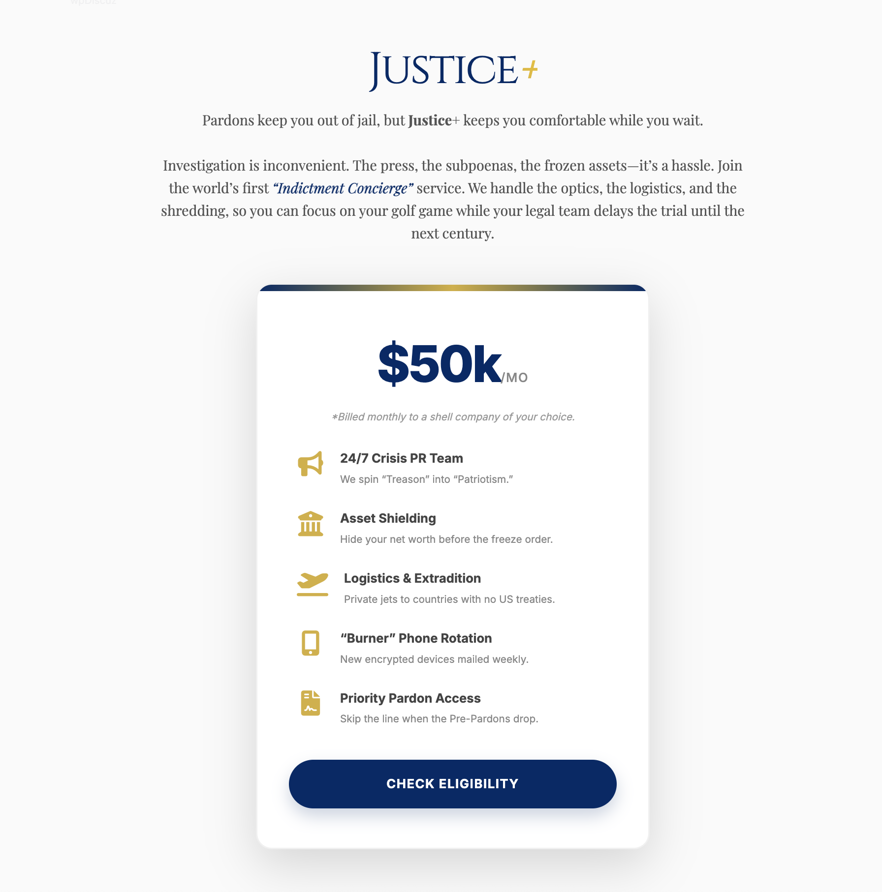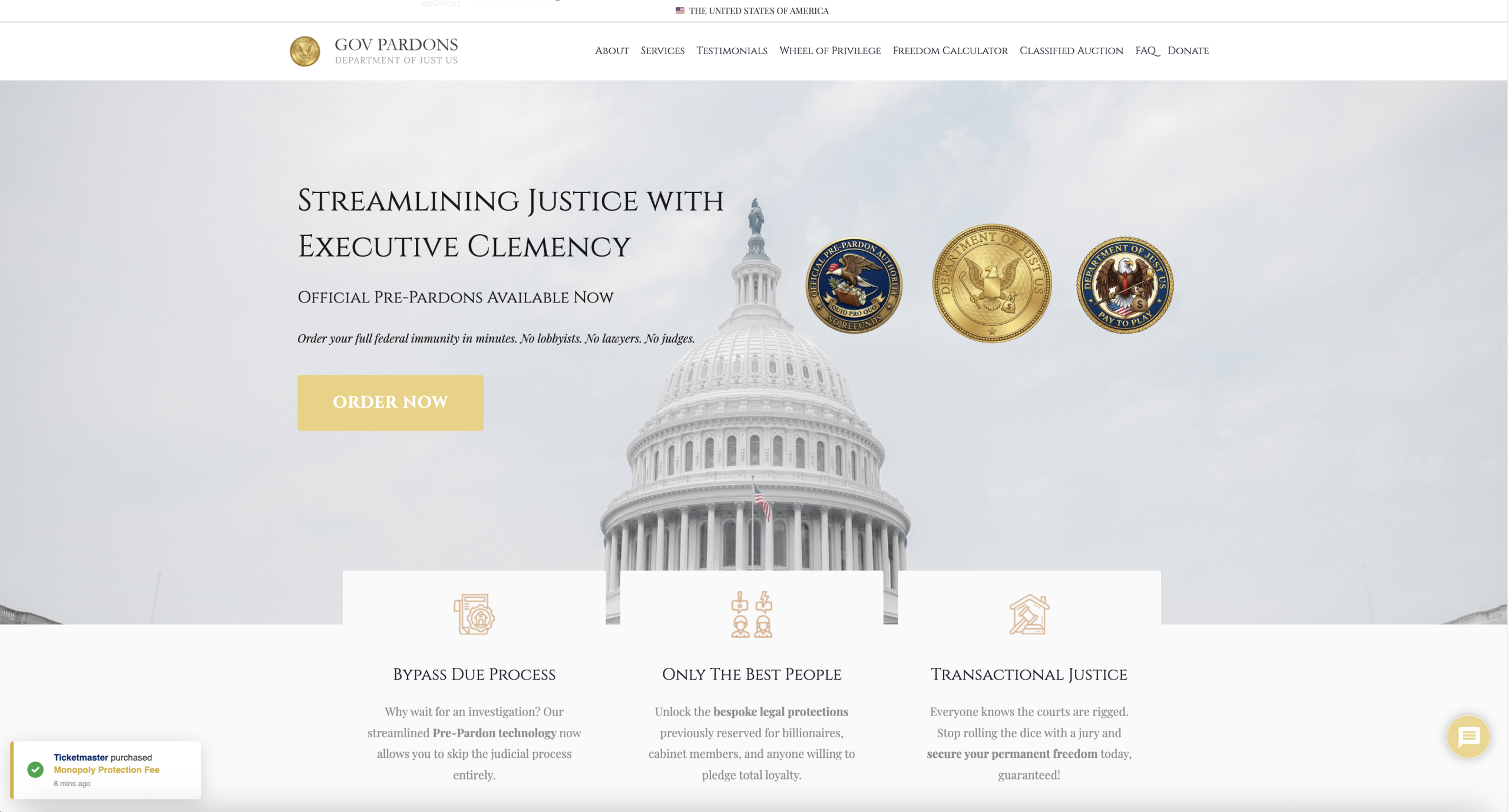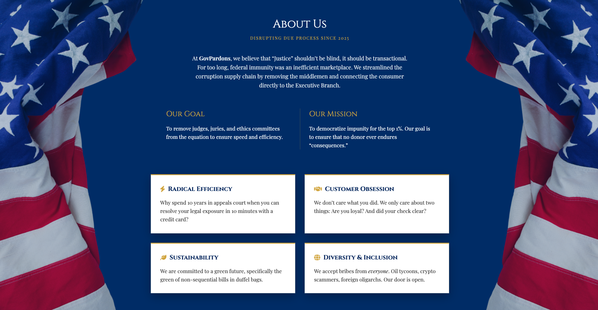 In an era where consequences are increasingly optional for the elite, GovPardons democratizes access to impunity. By removing inefficient middlemen, such as judges, juries, and ethics committees, we connect consumers directly to Executive Clemency. The site features a Freedom Calculator, a Pre-Pardon Generator, and a Classified Document Marketplace.