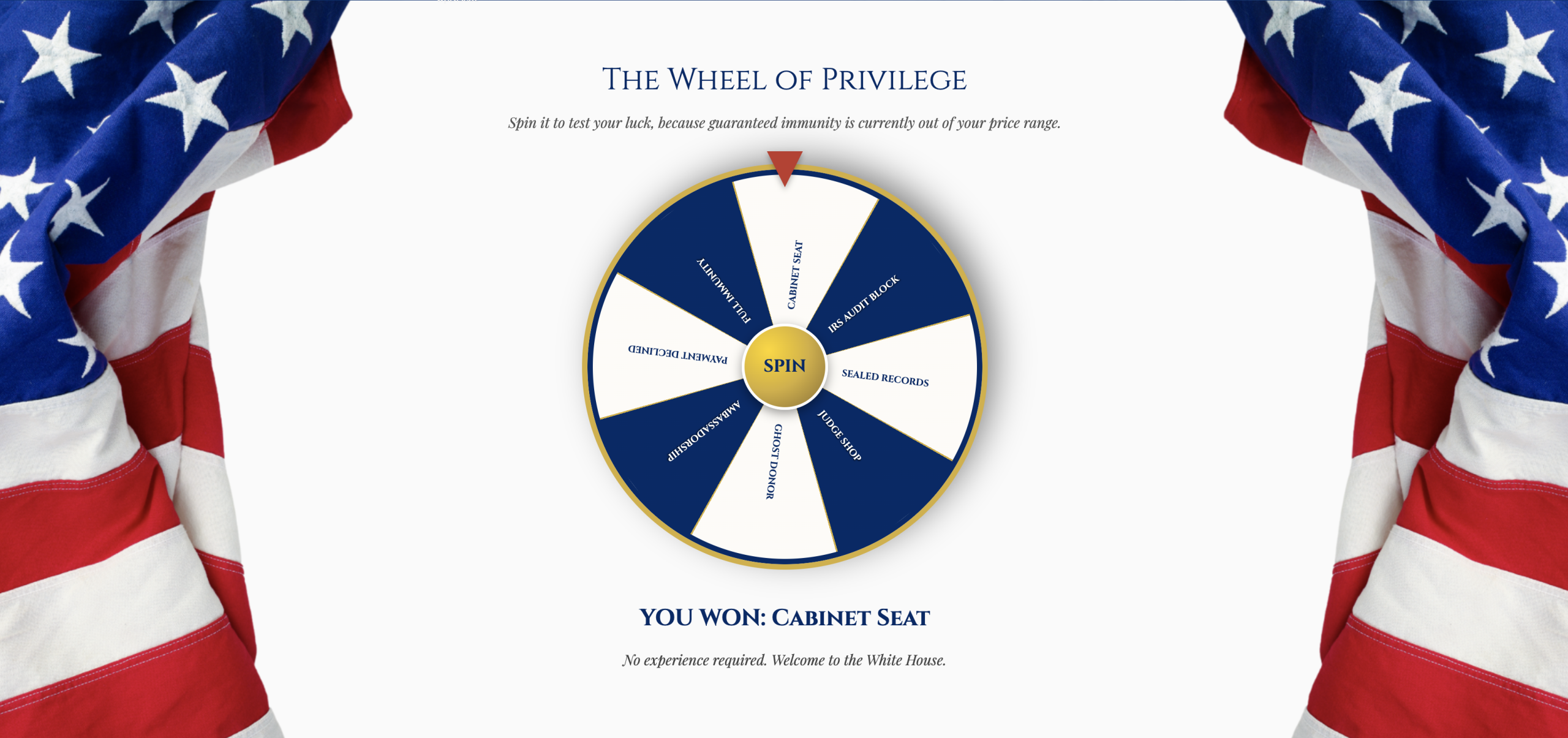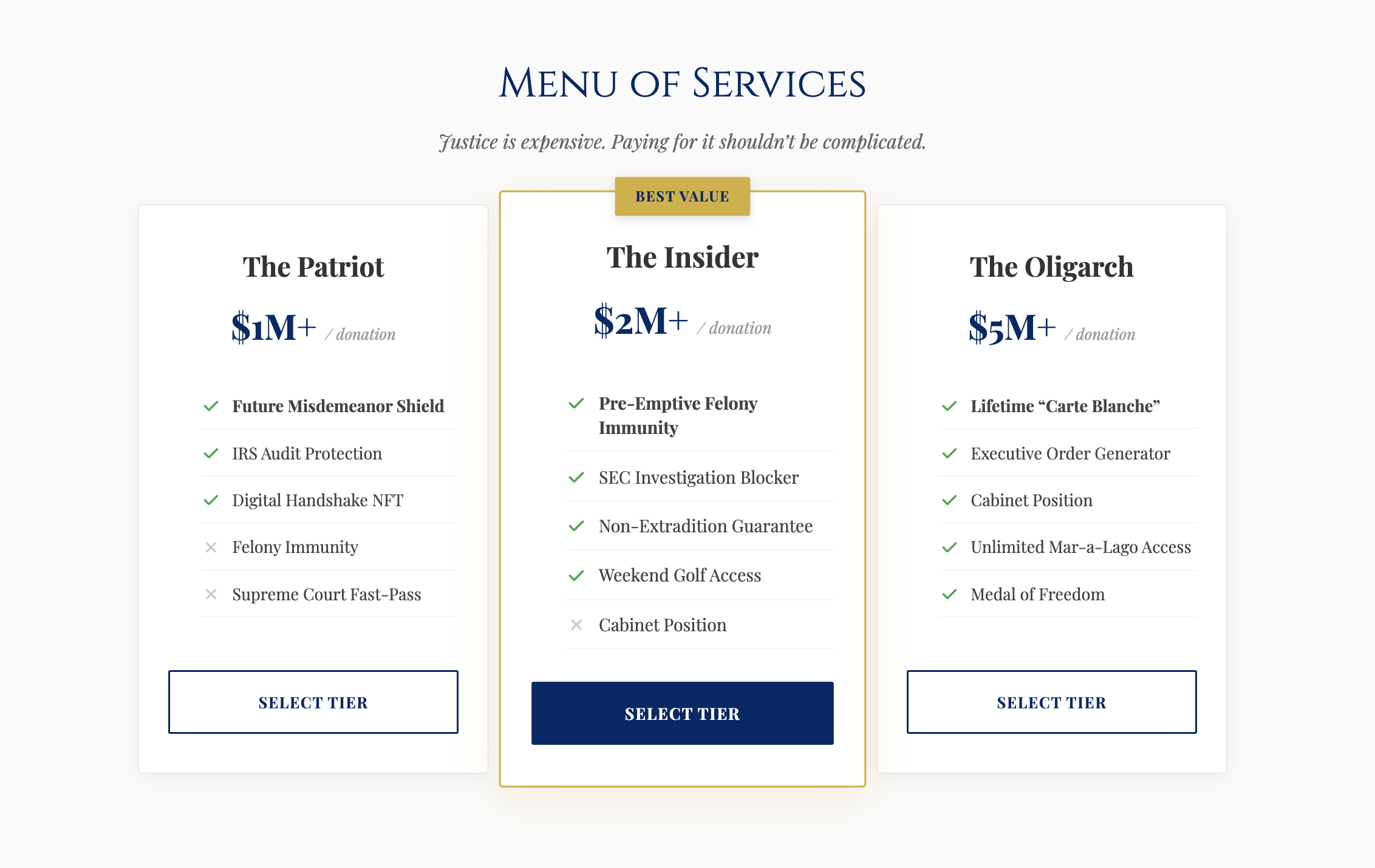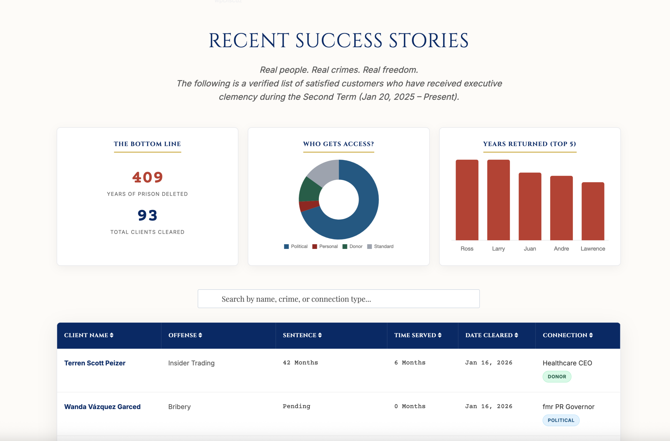 In an era where consequences are increasingly optional for the elite, GovPardons democratizes access to impunity. By removing inefficient middlemen, such as judges, juries, and ethics committees, we connect consumers directly to Executive Clemency. The site features a Freedom Calculator, a Pre-Pardon Generator, and a Classified Document Marketplace.